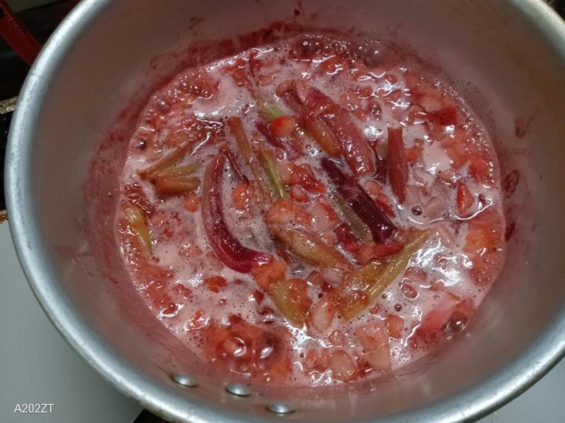 我が家の家庭菜園で採れた”ルバーブ”は冷凍しておいてジャムにします、同じく冷凍しておいたイチゴやブルーベリーをミックスしますと、ルバーブだけよりぐっとおいしくなる、またはブラックベリーや、ラズベリーの果汁だけ混ぜたりします、ミックスすることで果実感がましておいしくいただける。我が家はほぼ自家製ジャムですね・・今年の冷凍イチゴもブルーベリーもなくなったので、冷凍品の500gで300円チョットのもの(業務スーパー)を利用してます・・20から30分もあれば出来ます