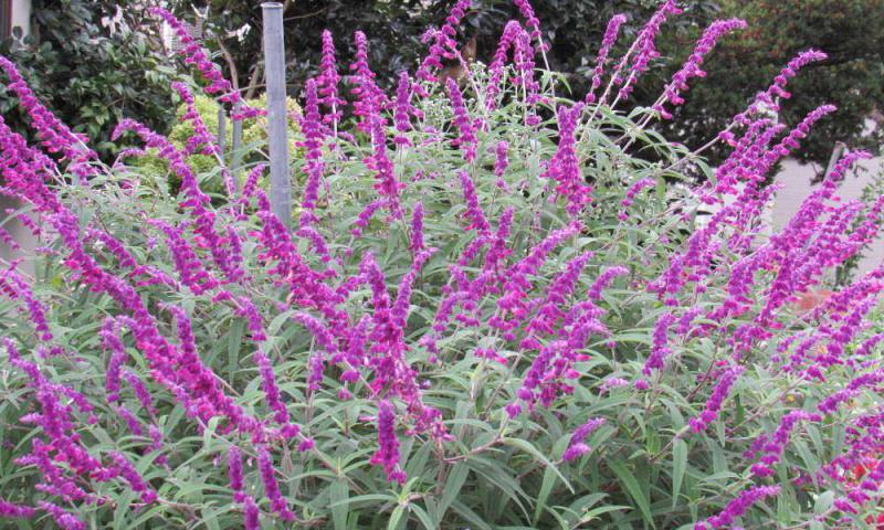 ●こんもりと咲き誇っている紫色の「アメジストセージ」に散歩中に出会いました ふわふわした紫色の花のように見える部分は花ではなく萼(がく)なんだそうです 萼(がくは短めの毛羽(けば)で覆われています フェルト生地(ベルベット)のような柔らかな手触りです 秋の宝石のようでうまく育てると背丈が150センチ 幅が2m以上に広がることもあるそうです