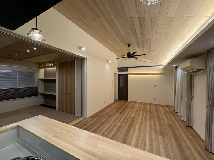 先週、完成内覧会を行いました。久しぶりの平屋の内覧会で勾配天井に桐材を使用して、調質効果を高めたデザイン性のある空間に仕上がりました。間接照明も取り入れて夜の空間は落ち着きのあるホテルライクな空間になったかなと思います。安らぎのある眠りやすい空間でした。和室も和モダンな雰囲気で一部間接照明を設定しております。洗面化粧台の方は造作で既製品を利用しながらアレンジしております。玄関の方のシューズクロークを分けることで広がりのある空間になります。