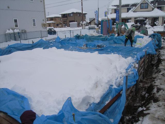 まずはブルーシートの上に溜まった雪の片付けからです・・・。