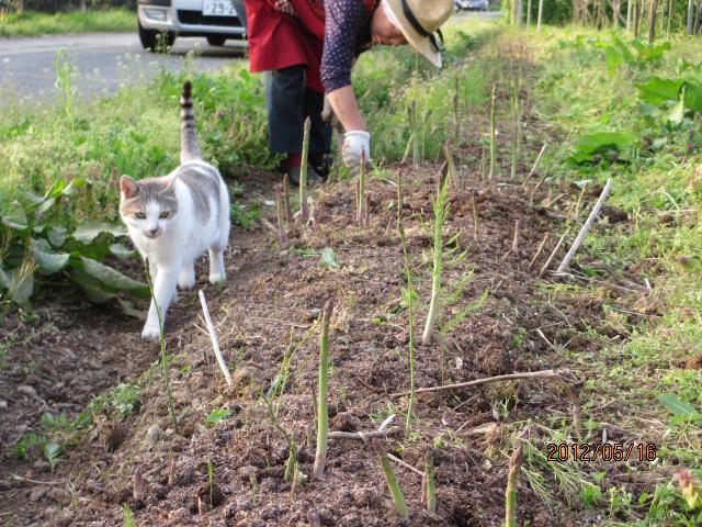 オババがアスパラ畑の草むしりしておりましたところ、猫のフーちゃんもおりました。本日のフーちゃんはパトロール中です。アスパラ畑にはネズミ多いのです。ネズミにアスパラの根をかじられ、アスパラが駄目になってしまい困っています。