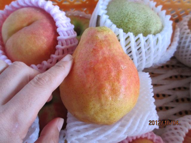 写真はレッドパートという西洋ナシの品種です。皮が赤や黄色になるきれいなナシです。