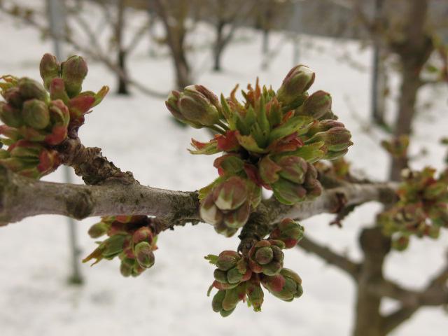 今、上山市の桜は7分咲きぐらいでしょうか、同じ科のさくらんぼの今日の様子です。