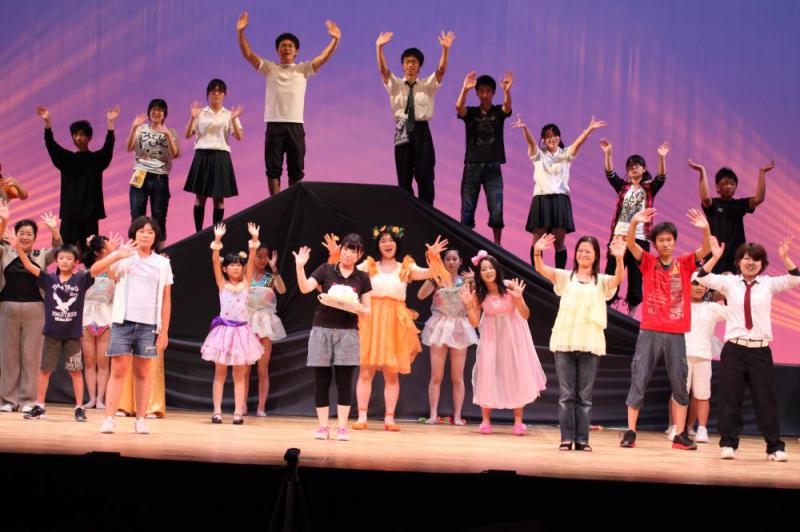 市民参加ミュジカル「ハッピーバースデー〜命かがやく瞬間〜」2013年バージョン舞台写真です。チームツナミ&公益文科大学演劇部ねこじゃらしのメンバー大活躍したよ。公文大演劇部猫たちは、準主役ダイスケ(小学生を演じるのに苦労!)ミツオ(最後の一週間は、無我夢中。)音響(一人で、200以上のきっかけのBGMとSDをこなすスーパーです。)を担当。そのほか、大道具の出し入れも。そして、チームツナミは、いじめられっこ順子の父役と死神と舞台監督(これも、すーぱーです。)橋本先生役と死神(テンポアップのダンスに合わせながらも不気味さをかもしてこわかったね。)と大道具と制作で。仕事で休めなかったメンバーの分まで働きました。