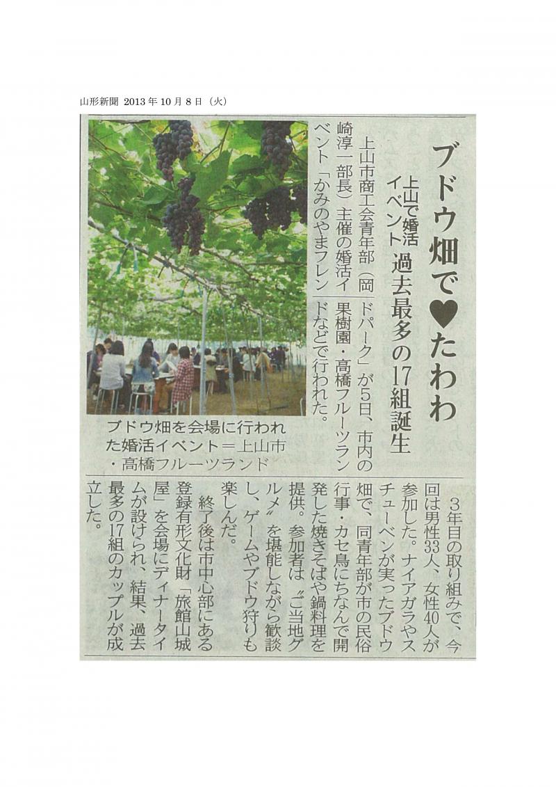 先日は、上山市商工会青年部主催のかみのやまフレンドパーク2013にご参加いただき、ありがとうございました。天候にも恵まれ、無事当イベントを終えることができました。結果としては、17組ものカップルが成立し青年部スタッフ一同その成果に喜んでおります。