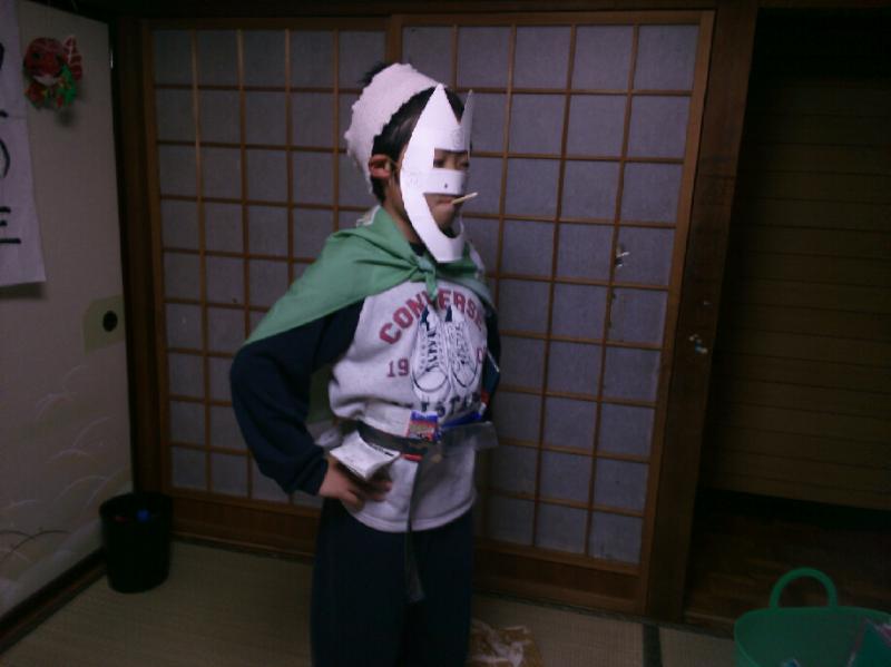 ママがミラクルエースのお面を作ってるとき、P君はせっせとふろしき巻いたりし