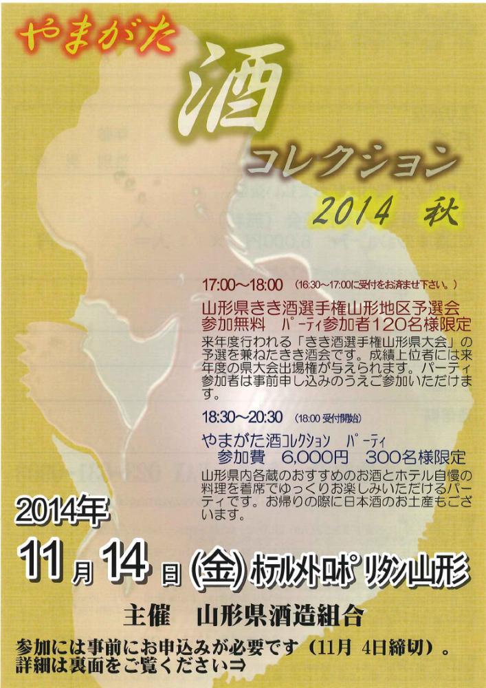 毎年好評をいただいておりました「山形酒歓評会」が、「やまがた酒コレクション」と名前も新たに、今年も開催されます。東北清酒鑑評会用の出品酒から、お燗で美味しいお酒まで、山形県内各蔵のおススメのお酒とホテル自慢のお料理を堪能できるパーティーです。さらに、お帰りの際は日本酒のお土産つき! 2014年11月14日(金) ホテルメトロポリタン山形参加費6,000円 300名様限定お席の数もあとわずかです。ご興味のある方はお早めにお申し込みください。