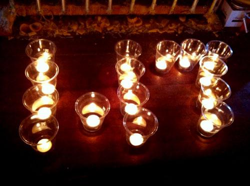 写真のように最低15個のティーライトキャンドル(アルミカップ入り)をブラカップに入れれば簡単にできます。ティーライトキャンドルは100円ショップで購入できます。風が強ければ砂利を入れるといいですね。