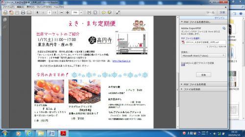 今週の土曜日、1月17日の午前11時〜午後5時まで、杉並区高円寺コミュニティマーケット「座の市」が開催されます。えき・まちネットこまつとしては、今年度最後の出店になりますので、みなさん、ござっとごえな。今回は、主催者側が餅つきをします。また、私たちは米沢牛串焼きと玉こん、他県では富士宮焼きそばや沖縄豚角煮などが出店します。もちろん、高円寺界隈の美味しい店、楽しい店もたくさん並びますから、是非お出でください。