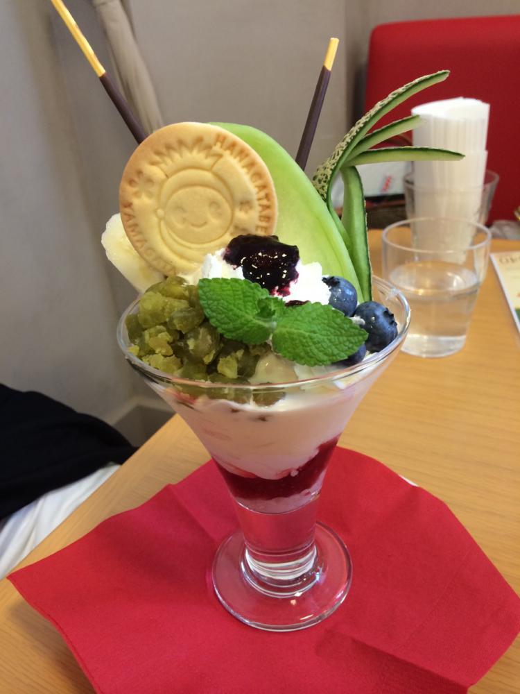 今日は、おによめ夏の会議の日! (今年のおによめ旅行の相談ですけど)  久々に東根から脱出です。場所は・・・・山形まなび館 の中にあるカフエ         どんどん焼きで有名ですよね。!(^^)!   べにちゃんパフエを食べてきました。実はこのパフエ、 べにちゃんクッキーの前にちょこんとのっているワイン色のやつが  おによめ.comの 紅さやかのジャムなんですよ(^O^)/  他にも ふうき豆 ブルーベリー メロンなんかがのっかってて   すべて県産品を使ってるとか            バナナは違うと思いますが・・・・(^_^;)    ふうき豆とアイスってとっても合うんですよね〜〜  おによめメンバーおすすめのパフエです。    是非食べてみてくださいね