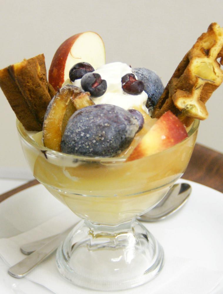 フルーツパフェが好評でしたので、特盛フルーツパフェが登場です。贅沢に一人で食べるのもいいですが、二人仲良く食べるのも楽しいかも。旬のくだものとソフトクリームを中心に桃、西洋梨(シルバーベル)、ブルーベリー、プルーンそしてすもも(ブラックキング)のソースにワッフルを添えた当園自慢のフルーツたっぷりのパフェ。たっぷり時間をかけてご堪能下さい。普通サイズが750円、特盛が1000円。お得です。