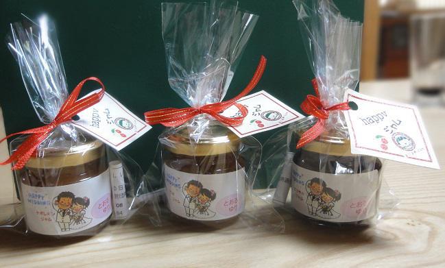 9月〜10月にかけて3件の結婚式がありました。 そこで 結婚式の最後のお客様へのお見送りの時にお渡しするあれ? ミニプレゼントですがおによめ.comのサクランボジャム のご注文をいただきました。 90入りで とってもかわいい感じの仕上がりです。名付けて Happyジャムおによめピンクさんが心をこめて作ってくれました。ラッピングとシール貼りは お二人の共同作業・・・仲良く二人で あ〜〜だこ〜〜だと リボンを結んでいる光景は とてもほほえましいものでした。いつ いつまでも、あま〜〜い関係でいてくださいね。
