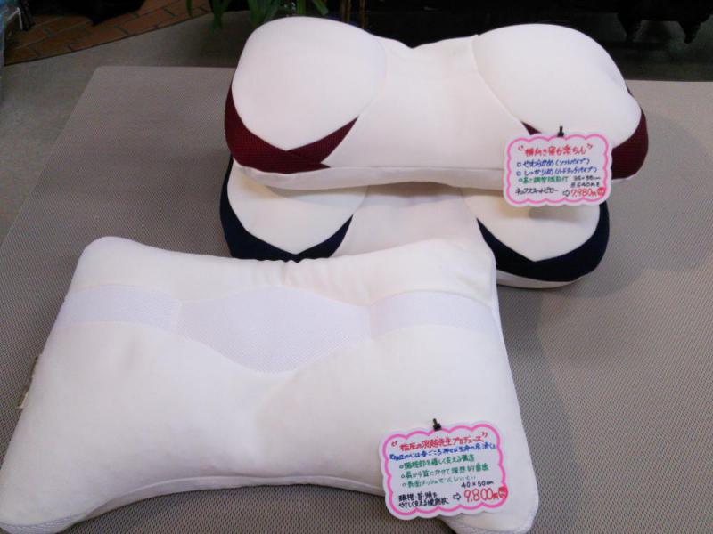 「枕を変えたら、朝が違った!」とうれしい声をいただきました。 枕と敷布団の特設売り場を開設して気づいたことは、枕に悩んでいる人はかなり多く、性別や年齢に関係ないということです。「そんなお悩みを抱えていらっしゃる方々のお役にたちたい!」と売り場を開設しましたが、お客様からのうれしい声で、私の思いも報われます。 現在の売り上げ数第一位は京都西川、「浪越先生の 頚椎・首・頭を優しく支える健康まくら」(写真手前)・・・店頭価格9,800円第二位は、これも京都西川ですが、「ネックスフィットピローやわらかめ」(写真奥上段)・・・店頭価格7,980円詳しくは→http://marushime.jp/
