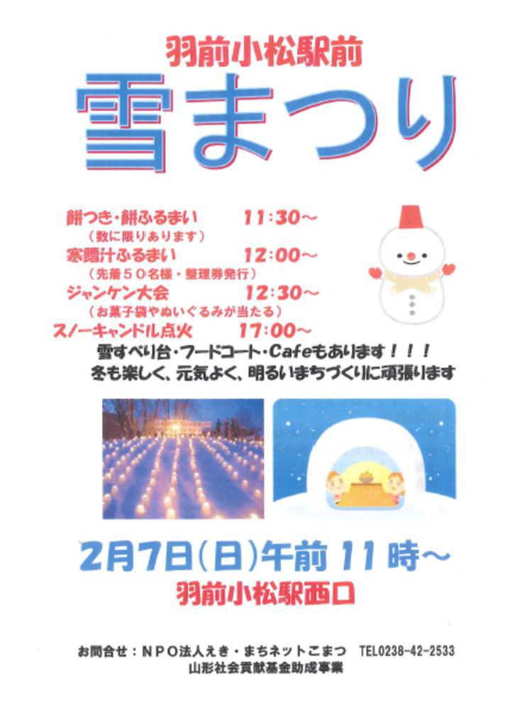 【羽前小松駅・ミニミニ雪まつりを開催】2月7日(日)◆会場は・・羽前小松駅前広場雪不足の置賜地方ですが、ここ小松の地も同様です。...雪が少なくても、大丈夫・・・楽しい催しと美味しい「寒だら汁」で日曜日のひと時を過ごしてみませんか!!家族でのご参加大歓迎!!★★★羽前小松駅・雪まつり★★★(*^_^*)餅つき・餅ふるまい :11:30〜(*^_^*)寒たら実ふるまい :12:00〜(*^_^*)ジャンケン大会 :12:30〜(*^_^*)スノーキャンドル天下:17:00〜◆主催者:NPO法人えき・まちネットこまつ◆お問い合わせ:0238-42-2533