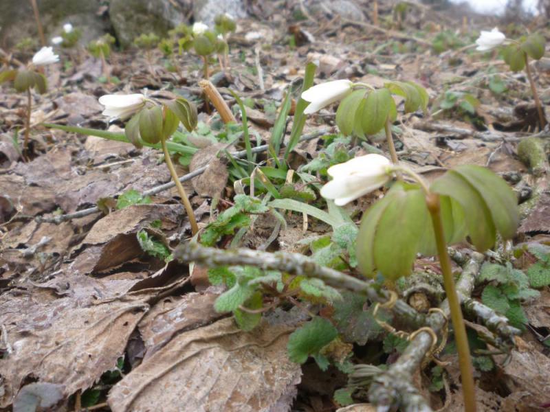 雪が溶け枯葉の中から一番最初に顔を出すのが白くて可憐なイチゲの白い花です。これはつぼみで昼暖かくなると菊のように花が開きます。