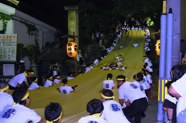 9月11日でしたが、勇壮な太鼓の響きとともに、通称「暴れ獅子」と呼ばれる獅子が街へ降り、市内を駆けめぐる、南陽市赤湯温泉の烏帽子山八幡宮例大祭及び赤湯温泉ふるさとまつりで暴れ獅子があるというので観てきました、暴れ獅子太鼓は、祭りを盛り上げるため昭和56年に創作されものだそうでわりと新しいようです、青い目の外人さんもいました、神社に向かって一礼して始まります、女性が多く、髪を上げ粋ですな・・・。暴れ獅子、幕の中央付近に獅子頭があり、幕の前後左右に数十人の若者がつき、互いに前と後ろで引き合い、引き勝った方向へ進むとのことです、石段の上にのぼり駆け下りるが中の獅子頭持ってる人こけたら大変だ、カメラもって道の端にいたがかなりのスピードで駆けて行きます。