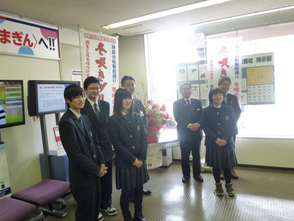 2月3日から第1回冬咲きダリヤまつりが開催しました。この祭りは、真冬のイベントが少ない川西町を賑やかにしようと企画したもので、8日間に及ぶダリヤ巡りと2月5日に羽前小松駅前で開催する雪まつりイベントが一緒になったお祭りです。 まず、冬咲きダリヤ巡りは、羽前小松駅、小松地区交流センター、川西町役場(町長室・まちづくり課)、川西町商工会、山形銀行小松支店、JA山形おきたま川西支店、米沢信用金庫川西支店、山形中央信用組合小松支店、小松郵便局、茂木食堂、あっさり食堂、繁昌軒、料亭喜楽、パリドール・サノ、東やまこ商店、菓匠十印、銘菓の錦屋、わたや商店、若者Cafeぼ〜の&こまつ屋の19施設20カ所にダリヤのアレンジメントを飾り、川西町を来訪する皆様に、それぞれの施設を廻って花をご覧いただく企画です。写真@は山形銀行での開始式の様子、写真Aは羽前小松駅待合室のダリヤと御客様。次に、2月5日(日)には雪まつりイベントも開催。前日は置農生のお手伝いを得て、雪の滑り台やスノーキャンドルの制作。そして5日は、餅つきと餅のふるまい(写真B)、そして寒鱈汁のふるまい(写真C)、さらにフードコートに、雪の滑り台、じゃんけん大会(写真D)、夕方はスノーキャンドルに点火と、楽しい1日になりました。 200名近くのお客様にも大変喜んでいただきました。ダリヤ巡りは2月10日まで続きます。みなさん、ござっとごえな!