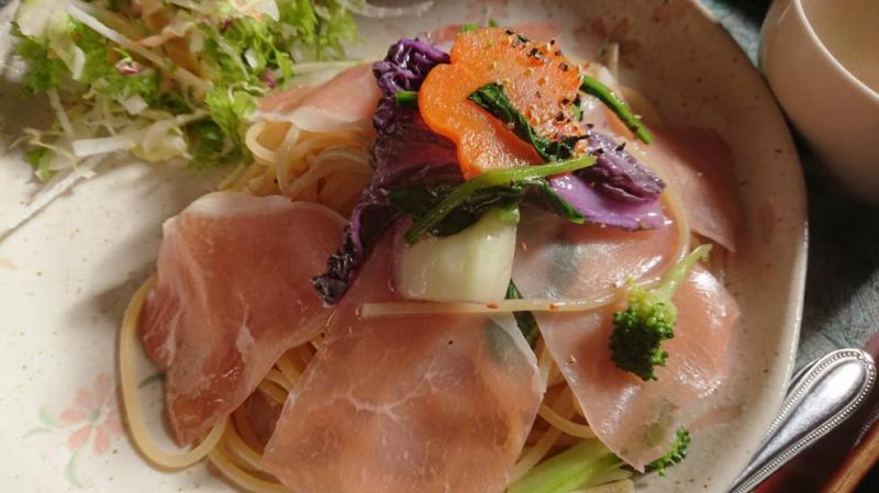 オープンから約10年大人気!!「季節野菜の生ハムパスタ」¥880この時期は「ほうれん草と紫白菜」が入っております。カラフルで美味しいそうです。(美味しいです)**野菜は、当日何があるかで変更になりますので ご了承くださいませ~(^^♪