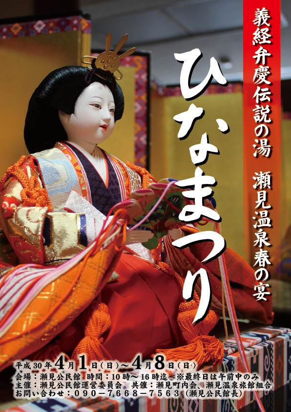 義経弁慶伝説の湯 瀬見温泉 春の宴 ひなまつり瀬見温泉の旧瀬見小学校で、旅館や家庭から持ち寄った様々な種類の雛人形、約500体が展示されます。享保(きょうほう)雛(びな)や現代雛など、江戸時代から現代までの時代を彩る人形が飾られます。期間中は甘酒や瀬見温泉まんじゅうの無料提供も行われます。会場となる公民館には「きまぐれcafé」がありランチやスィーツなども楽しめます。入場無料ですのでお気軽にお立ち寄りください。? 【 期 間 】平成30年4月1日(日)〜4月8日(日) 【 時 間 】10:00〜16:00(最終日は午前中のみ) 【 会 場 】瀬見公民館(旧瀬見小学校)      ? 山形県最上郡最上町大字大堀742 【 問?? 合 】瀬見公民館運営委員会 090-7668-7563
