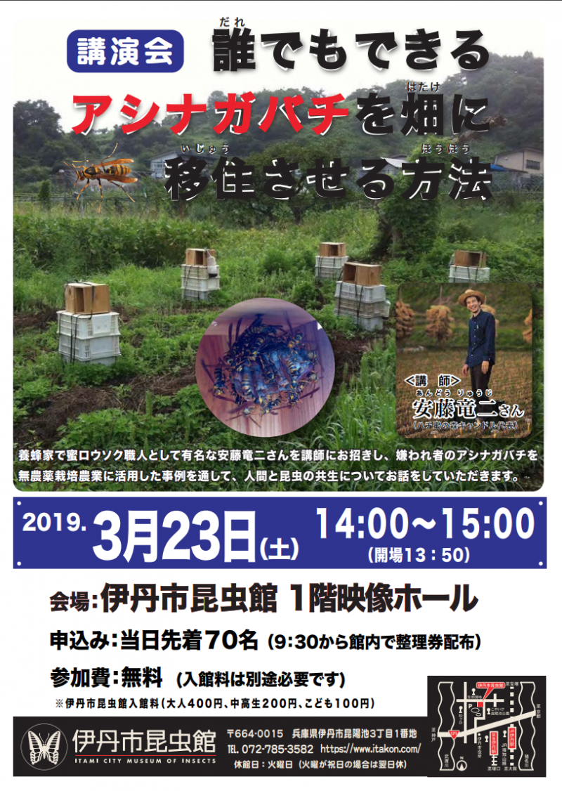 養蜂家で蜜ロウソク職人として有名な安藤竜二さんを講師にお招きし、嫌われ者のアシナガバチを無農薬栽培農業に活用した事例を通して、人間と昆虫の共生についてお話をしていただきます。