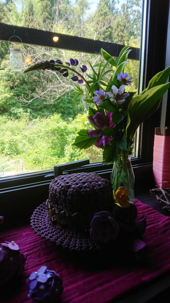 本日の窓辺は庭のお花を摘んでみました(^。^)v「みやこわすれ・ルピナス・クレマチス・ブラックベリーの花斑入りぎぼうし・なるこゆり」です。クラフトの手作り帽子とバラの花・あじさい・あやめです。お客様がよくこの窓辺をインスタであげていらしゃる場所でもあります(^^♪**ちなみに、私は午前中のうまく撮れませんでした。
