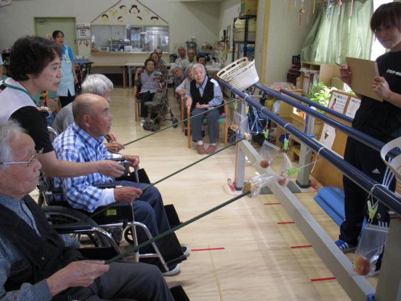 9月17日〜20日にかけてミニ運動会を行いました。車イスに乗ってのパン釣り競争・風船送り競争・紐巻き競争・・・白熱した戦いでした。競争と言いながらも笑いある運動会でした。