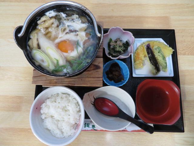 卵の入ったうどんと、野菜のてんぷら、漬物、ご飯がセットで税込900円!