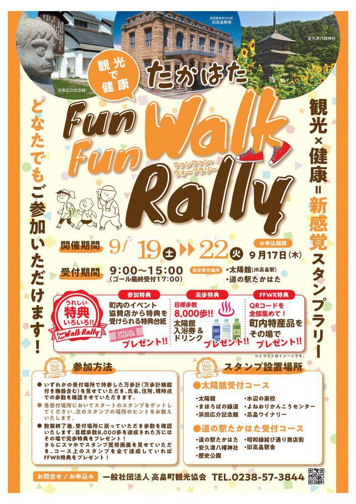 スタンプを集めながら町内を巡る「観光で健康 たかはたFun Fun Walk Rally」開催!多くの方々にご好評いただいている「たかはたFun Fun Walk」が期間限定でウォークラリーにバージョンアップ!コース上にあるスタンプを探してスマートフォンを使って全部ゲットすると、その場で町内特産品をプレゼント!もちろん8,000歩達成で太陽館入浴券とドリンクもプレゼント!町内外問わずどなたでもご参加いただけます!事前にお申し込みをお願いいたします。・開催期間 :令和2年9月19日(土)〜22日(火)・開催時間 :9:00〜15:00(ゴール最終受付17:00)・申し込み期限:令和2年9月17日(木)・申し込み先 :高畠町観光協会 TEL:0238−57−3844 道の駅たかはた TEL:0238−52−5433イベントの詳細は添付のPDFファイルをご覧ください。皆様のご参加をお待ちしております!