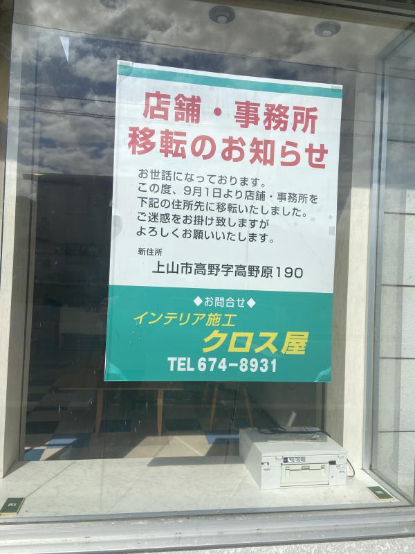 いつもお世話になっておりますりインテリア施工クロス屋です!!今日はご報告があります。今まで上山矢来に店舗・事務所がありましたが移転する事となりました。お客様にはご迷惑おかけしますが、今後は高野の方にあるペット対応住宅展示場が新店舗になります。今後ともインテリア施工クロス屋をよろしくお願いします。電話番号・FAX番号などは変わりません。☆クロス・床材の張替え・☆障子☆襖など内装屋工事でお困りの方、なんでもご相談ください。新しい店舗・事務所上山市高野字高野原190TEL 023-674-8931FAX 023-674-8935 インテリア施工クロス屋まで