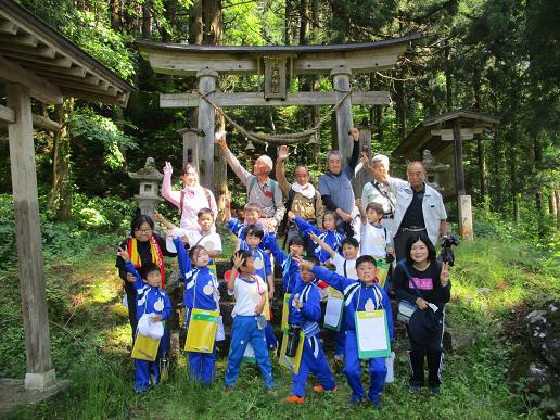 今日は2年生の羽黒の森探検。地域の先生方に一緒に行っていただき、貴重なお話や珍しいものを見せていただきました。いよいよ始まります。「よろしくおねがいします!」皆様を、羽黒の森にいざないましょう…。「まず、あっちさ行って、話します!」「大宮子安大明神。安産、そして子育ての神様です。小国に神社があります。お賽銭、とってわりぞ、ばぢあだるがら。」私も60日に一回、虫が天に昇らないように夜通しお酒を飲んで起きていなければ…。熱心に、びっくりするくらい上手に話を聴く2年生!「山の神様は、男性が女性の話をすっど嫉妬すっから、女性の話はでぎません。」「なんで?」「わがんね〜。」「あどがらおしぇっから・・」先生方は、2年生の質問にたじたじ・・・。「夫婦杉です。くっついったべ?」「めおと?」「そう、お父さんとお母さん。」「なんで?なんでくっついでっどお父さんとお母さん?」「ん〜、説明むずがすいな〜。」「めおとすぎ・・」つぶやきながらメモしています。「もうやんだは〜、つらい〜」「つかっちゃどごで、クイズ!この中さ何あっが、わがる人?」「くま!」「きつね!」いろいろな答えが飛び交います。答えは、消毒用のホース。松くい虫用だそうです。「坂、つらい〜。」「もう少しで、休憩だがら、がんばれ〜!」着いた!みんなで、ポーズ!眺めもばっちりです。休憩後は、この2つについて説明していただきました。「この松ぼっくりの違いはな〜んだ?」「りす!」「りす食うどそうなるんだよ!」「おっ!参った!その通り。すごいなあ。」休憩が終わり、羽黒神社に向かってまた登ります。その途中で、姫城に逃げたお姫様の病気を治そうと薬を取りに来たその息子と乳母の伝説をお聞きしました。一生懸命にメモを取るこぐわっ子の顔に見入ってしまいました。もうすぐ羽黒神社というところで、羽黒の大杉に出会います。太いし、高いし、とても立派です。そしてその木には・・・なんと「ライオン!」地域の先生方は、「クマ「に見えねが?」とおっしゃってましたが、がライオンといえばライオン、クマといえばクマ、それにしてもすごい自然の芸術です。 羽黒神社につくと、そこにはクマのひっかき傷のある杉の木。みんなでしばらくみとれました。みんなで木の幹の太さを測ったり・・・お参りしたり・・・たくさん質問したり、天狗が来たという木を見たり…たくさんの勉強をしました。山菜の「みず」とりをしながら帰ったこぐわっ子も・・・。約半日かけての羽黒探検の森。いかがでしたか?熱中症にもならず、誰もけがもなく無事に帰ってこられて、めでたしめでたし。 お時間のある方は、こぐわっ子が経験した羽黒探検の森、ぜひどうぞ!