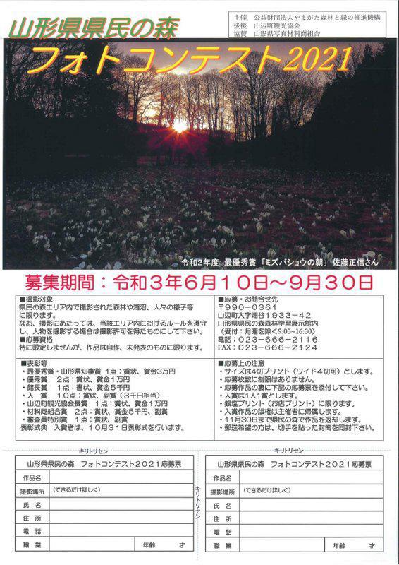 県民の森では、「県民の森フォトコンテスト2021」の作品を募集しています。撮影対象は、県民の森のエリア内で撮影された森林や湖沼、人々の様子等に限ります。四季折々に変化する県民の森の様子をカメラで撮影してみませんか!なお、最優秀賞には、賞状と賞金3万円が贈られます。その他、多数の賞を用意しております。多くの皆さんの応募をお待ちしています。 山形県県民の森フォトコンテスト□応募期間   令和3年6月10日〜9月30日□撮影対象   県民の森エリア内の様子□応募資格   特に限定しませんが、作品は自作、未発表のものに限ります。□応募・お問合せ先           〒990-0361        山辺町大字畑谷1933-42        山形県県民の森森林学習展示館内            (受付:月曜を除く9:00〜16:30)        電話:023-666-2116  FAX:023-666-2124
