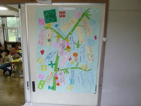 今日は朝から天気もすっきりしない・・・。こういう日は子供達の様子もどこか元気がない・・・。教室ではどうだろう・・・校内は、明日の七夕集会を控え、どの教室にも短冊いっぱいの竹が飾られています。願い事を覗いてみよう・・・。子供達の視野はすでにグローバル!何と頼もしい!全校を回ってみて、最も多い願いは、「早くコロナが収まり・・・・」でした。早く元の生活に戻れますように・・・。5年生の教室に入ってみると、授業は社会のようです。教科書や資料集を使っての調べ学習です。社会科はこのほかに地図帳もあるので、なにを使って調べればよいかも大事な勉強です。5年生の合い言葉。1学期はどうだったでしょうね・・。最後まで意識してがんばろう!4年生へぶらり・・・。理科の勉強です。机の上には、何やら楽しそうな教材が・・・。なるほど、実験してわかったことを図や言葉で表すんですね。友達にわかりやすく説明できるようにまとめられるかな・・・?まずは、どんなふうに飛んでいくのか調べないと・・・こっちで「ぽん!」 あっちで「ぽん!」球が飛び出す音があちこちに響きます・・・。友達に当たってしまうのではないかと察知した先生が、誰もいない廊下で実験するよう指示。さすが平塚先生、すばらしい判断力です!!ただ「ポン、ポン」遊んでいるのではありません。こうして実験してみて、気づいたことやわかったことをすぐにノートに記録しています。これが勉強です!!4年生の黒板にはこの3文字が・・・。3年教室へぶらぶら・・・夏休み前に、とてもタイムリーな勉強ですね。一日のよりよい生活の仕方を考えているようです。ぜひ、今日の勉強を夏休みの規則正しい生活へ結びつけてくださいね!3年生の教室でも子供達の合い言葉を発見しました!!「わ・か・ば」・・・そうです!教室は間違える場所、わからないことを考える場所なんです!1年生も習ったひらがなを使って一生懸命に書きました!残念・・・教室に元気な1年生の姿はありませんでした。体育かなあ・・・でも、見てください!!この綺麗な机と椅子を!教室を離れるときは、必ず整頓してから離れる約束なんでしょうね。とっても気持ちいい!!隣の2年生を覗いてみると・・・練習中?話を聞いてみると、町探検でわかったことをクイズ形式で知らせるための発表のようです。他の班は別のところで練習のようでした・・・教室入り口のドアにはこんなポスターが・・・。だから2年生はあいさつが上手なんですね!!納得納得・・・おっと!!さすがです!6年生の教室もありました!元気なあいさつを「6年生から」もっともっと広めていってくださいね!教室内には、こんなポスター!?も・・・。これは何だろう?友達にお勧めの本を知らせるためのものかなあ・・・それにしても絵がうまい!短冊に、夢を記したものが多い6年生。自分の将来をしっかりと見据えている姿に感激です!願いが叶いますように・・・。今日の昼休みは、7月30日に行われる町水泳大会に向けて練習する、強化練習のオリエンテーションが行われました。総勢19名がエントリーしました。4年生5名。5年生3名。そして6年生11名。さすがです。どんなことにも果敢に挑戦しようとする姿を4,5年生に見せてくれています。これでこそ最高学年です。本番でも最後まで諦めず、自分自身に打ち勝てるよう期待しています!がんばれ、東根っ子!!