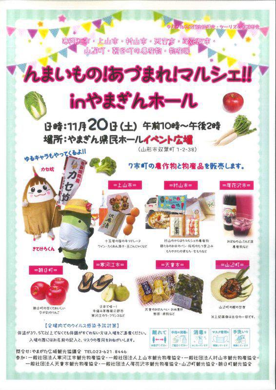 11月20日(土)に、やまぎん県民ホールイベント広場にて「んまいもの!あづまれ!マルシェ!1」が開催されます。村山広域7市町の農作物と物産品を販売します。山辺町からは、町の特産品でもある要害の鯉の甘煮を販売します。皆様のお越しをお待ちしております♪ んまいもの!あづまれ!マルシェ!!inやまぎんホール日時:11月20日(土)時間:午前10時〜午後2時場所:やまぎん県民ホールイベント広場お問い合わせ:やまがた広域観光協議会        TEL023−621−8446