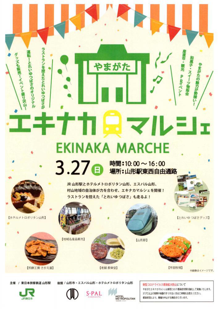 3月27日(日)山形駅東西自由通路にて「やまがたエキナカマルシェ」が開催されます。山辺町からは、山辺温泉に併設されております、産直やまのべ温泉市が出店します。町の農産物を販売予定ですのでぜひ、お越しください!時間:10:00〜16:00