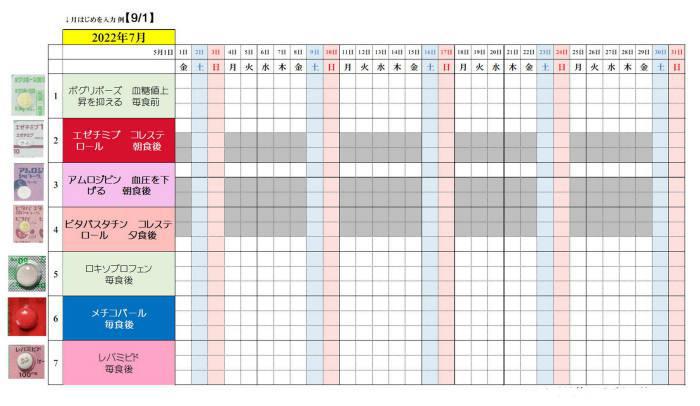 私の薬チェック表です。No.4までは、糖尿病関連 No.5.6.7は坐骨神経痛関連です。坐骨神経痛は、大分良くなって、長く歩かなければ、薬を飲んでいる限りは、痛みはほぼなくなりましたが、歩くと違和感があって、そのまま歩き続けると、悪化する予感がします。坐骨神経痛の薬は、痛め止めなので、あまり飲むなと医者から言われているので、毎食後を朝晩の食後に減らしています。上の表は、黄色いセル内に例えば(7/1)と入力すると、日付、曜日、土日の色セルの色が一瞬で変わります。超便利で色々応用できます。(ネットを参考)