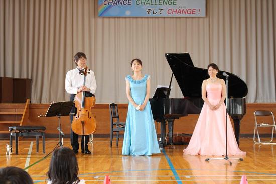 6月24日、新型コロナウイルス感染拡大防止のため、2年間中止してきたじじちゃ・ばばちゃの会が3年ぶりに復活しました。これまでは、授業参観や祖父母の皆様と触れ合う時間を取ってきましたが、今年度は新型コロナウイルス感染症がまだ収束を見ない状況にあるため、規模を縮小し、スクールコンサートのみ実施しました。今回聞いていただいたのは、「トリオ・アラモーレ」というグループ。ソプラノ歌手の高橋さん、チェロ演奏者の増川さん、ピアノ演奏者の須藤さんの3名でした。のびのある美しい歌声、チェロやピアノの見事な演奏に、聞いている子供たちそしてじじちゃ・ばばちゃの皆さんも心奪われていました。「とても感激しました」「知っている曲ばかりで、とても楽しい時間を過ごすことができました。」(参加されたじじちゃ・ばばちゃの感想)「体育館の中が一つになって手拍子したりでいい音楽会でした。」(参加されたじじちゃ・ばばちゃの感想)増川さんから、チェロという楽器についての説明や、弾き方によっていろいろな音がでることを実演していただきました。「いろんな虫の鳴き声、牛、パトカー、バイク・・・。弾き方次第でチェロがあんなにも心を和ませてくれることを知りました。」(参加されたじじちゃ・ばばちゃの感想)素敵な時間を作ってくださった「トリオ・アラモーレ」の皆さん、本当にありがとうございました。ぜひとも来年は、以前のような、子供たちと触れ合える時間が確保できる「じじちゃ・ばばちゃの会」にしていきたいと考えています。「これからもじじちゃ・ばばちゃの会がずっと続きますように・・・。(参加されたじじちゃ・ばばちゃの感想)話は変わりますが、今日はあいにくの雨となってしまいましたが、足場組みは行われています。ご来校されるときの駐車場は、校舎東側の来客用駐車スペースに停めてくださって結構ですが、体育館等に出入りする際は、このように、畑側に駐車してくださいますようお願いいたします。また、このようにプール側に停めてくださぅても結構です。しばらくの間、ご不便をおかけしますが、どうぞよろしくお願いいたします。