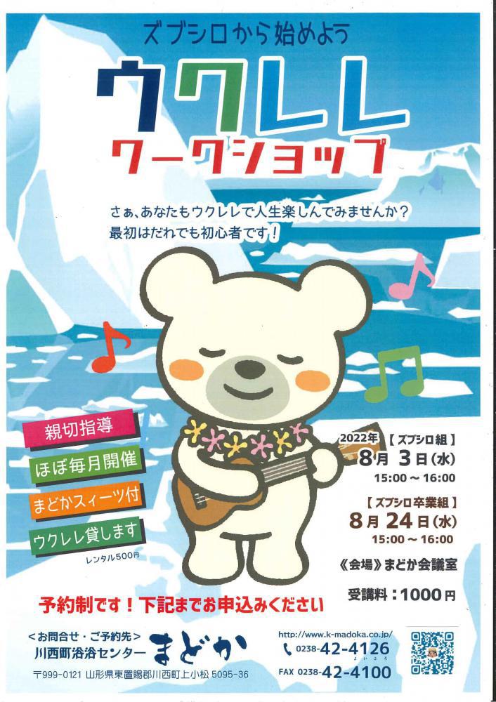 ウクレレワークショップ8月の開催日●ズブシロ組・・・8月3日(水) 15:00〜16:00●卒業組・・・8月24日(水) 15:00〜16:00会場:まどか会議室受講料:1,000円(まどか自家製スイーツ付)※ウクレレ貸します・・・レンタル料500円※予約制です!浴浴センターまどか TEL0238-42-4126(ヨイフロ)までお申込み下さい♪