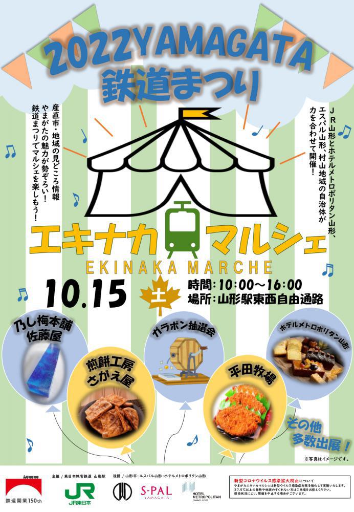 10月15日(土)山形駅東西自由通路にて「やまがたエキナカマルシェ」が開催されます。「2022YAMAGATA 鉄道まつり」のイベントに合わせたグッズ販売やガラポン抽選会をはじめ、エスパル山形や村山地域のお店が、おいしいものや名産品を販売します。今回はちょうど時期を迎える山形の秋の味覚「芋煮」をテーマにして、ちょっとした企画もご用意しております。山辺町からは山辺温泉に併設されております、産直やまのべ温泉市が新鮮な町の農産物を販売予定です。ぜひ、お越しください!