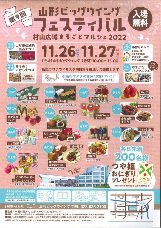 11月26日(土)、27日(日)は第9回「山形ビックウイングフェスティバル」が開催されます。村山地域の各市町村の特産品が勢ぞろいします。山辺町からは舞米豚の肉巻おにぎりやメンチカツ、要害産鯉の甘煮等を販売します。また、「山形市伝統的工芸品まつり」、「みちのくこけしまつり」、「手作りマルシェ」、「やまがたパンマルシェ」も同時開催します。ぜひ、遊びに来てください(^^♪  日時:令和4年11月26日(土)・27日(日) 10:00〜15:00会場:山形ビックウイング