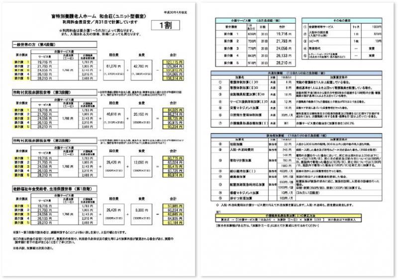 《 あくまで目安としてご覧下さい 》※詳しくはお住まいの各市町村の介護保険担当にご相談下さい。※料金表は平成30年8月現在のものです。 国の料金改正や施設基準の見直し等により変わります。※利用料金の目安は31日換算で行っております。月の日数によって変わります。  ご利用者様によっては2割または3割負担となる場合があります。※和合荘はユニット型個室(一人部屋)のプライベート重視の施設です。※下部にある加算額は、サービスの充実度で上がるため施設によって異なります。▼ダウンロードはこちら[PDF] → price-board.pdf