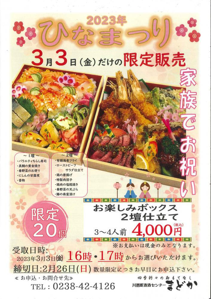 2023年 ひなまつり3月3日(金)だけの限定販売 お楽しみボックス2壇仕立て(3〜4人前) 4,000円税込み☆限定20個好評につき完売となりました!!☆受取時間・・・16:00OR17:00※最終締め切り2月26日(日)※お早めにご予約下さいませ TEL0238-42-4126まで!!