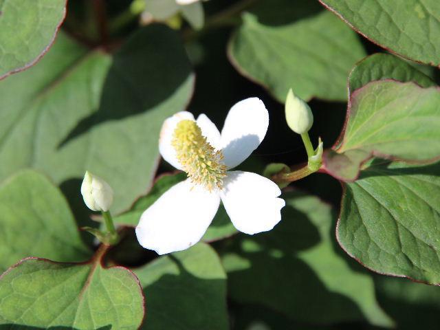●日陰の土地に群生し臭気のある「ドクダミ」が裏の川べりにさいています 形は愛らしいハート型で葉脈がクッキリと現れ 深い緑色が落ち着いた色合いで大人シックな印象です 6月の声を聞くと白い花をつけ下から順に咲いてきます 地下茎や葉は薬草としてもちいられてきたといいますが実際に使った記憶がありません