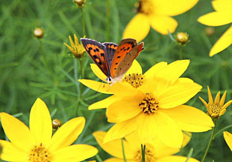 ●イトバハルシャギクが一斉に咲き始めました その花に「ベニシジミ」という蝶が留まって蜜をすっているのでしょうか この蝶は1年になんども発生するのだそうですが特に春から初夏にかけて野原にとんでいるそうです 1997年(平成9年)11月28日に30円切手の意匠となり2015年9月30日に販売が終了していますがあまり覚えていないです
