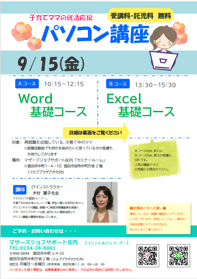 再就職応援『パソコン講座』のお知らせ ◇9月◇≪Aコース≫ 9月15日(金)10:15〜12:15『Woed基礎コース』Wordを初めて使う方や、久しぶりの方を対象に基本的な機能と操作方法をお伝えします。表の作成や編集、文章の編集、印刷。表の作成などを行います! ≪Bコース≫ 9月15日(金)13:30〜15:30『Excel基礎コース』Excelを初めて使う方や、久しぶりの方を対象に基本的な機能と操作方法をお伝えします。表の作成や編集、関数による計算、グラフの作成などを行います!♪片方のコースのみ、両方のコース、どちらの受講でも可能です♪ 【対 象】就職を目指している子育て中のママ※就職活動前で何かを始めたいママもOK【会 場】マザーズジョブサポート庄内 セミナールーム【料 金】受講料 及び 託児料 無料【託 児】 ※事前登録・予約が必要です。保育ルーム開室日【水・木・金】の 10:00〜16:00に登録にお越し下さい。 ※併設の保育ルームで、保育スタッフが お子さんをお預かりします。 ママは安心して受講いただけます。 【駐車場について】お車でお越しの際は、中町庁舎脇にあるセントラルホテル契約駐車場をご利用ください。(ジョブプラザさかたと表示してあります。)※契約駐車場が満車の場合は、酒田市中央地下駐車場をご利用ください。無料駐車券(最大2時間)を発行いたします。お帰りの際に、コンシェルジュ窓口へお声がけください。 ★★受講者の皆様へお願い★★場合によっては、体調の確認をさせていただくことがございます。状況によっては、ご案内の変更をさせていただきます。あらかじめご了承ください。★★ーーーーーーーーーーーー★★どうぞ、お気軽にお問い合わせくださいね。 ◇お申込み・お問い合わせ◇マザーズジョブサポート庄内TEL:0234-28-8061メールでのお申込みはコチラ