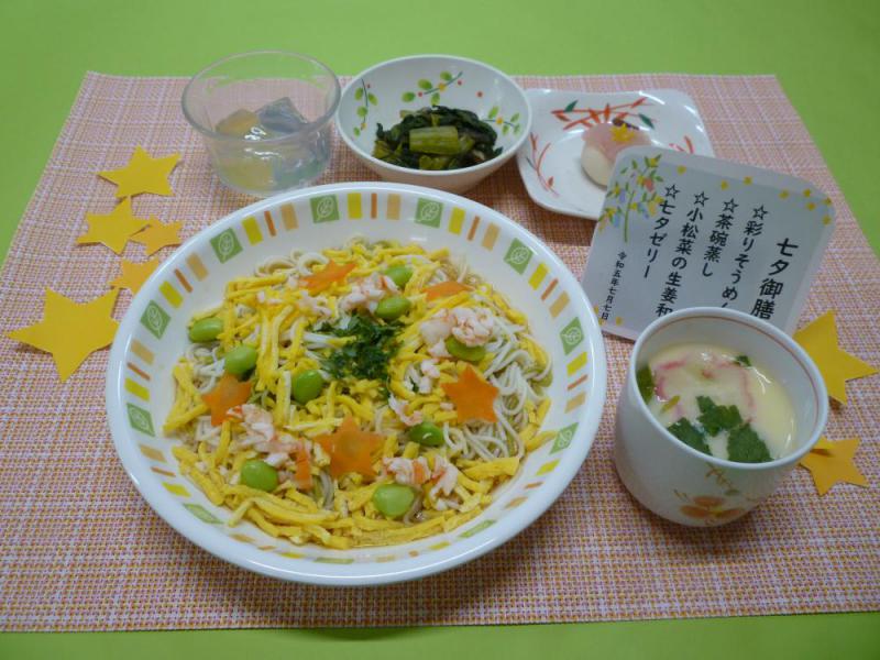 栄養課です。今回は七夕そうめんの紹介をしたいと思います。天の川の見立てたそうめんの上に色彩よく飾り付けをしました。蒸暑かったので、さっぱりとした献立で皆さんに大変喜んで頂きました。茶碗蒸しも大好評でした。