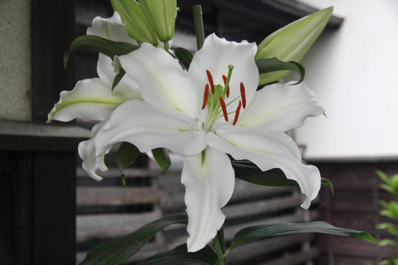●知人の玄関先にびっくりするほど大きな白い「ユリ」が咲いていました 育てている知人はこれまでこんなに大きな花を咲かせてくれたことがなかったと驚いていました カサブランカかなと思いましたが花の形や葉などから「ユリ」でしょうか 大きく咲いている花はまるで貴婦人のように華やかさを感じさせてくれました