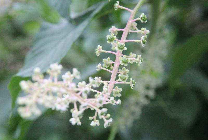 ●背が2メートルにも達するほど大きくなる「ヨウシュヤマゴボウ」を道ばたで花をつけていました 花の直径が5ミリくらいで花びらはありませんが5枚の丸っこいがくが開いてまるで小さな梅の花のように見えます 秋にはまるでぶどうのような実ができ 見た目は美味しそうですが有毒で食べられないそうです ただ鳥は好むようでタネは鳥によってあちこちに運ばれていき増えていくのだそうです 根や葉には有毒成分が含まれているそうですが実は有毒成分が含まれていないので鳥が食べても大丈夫なんだそうです