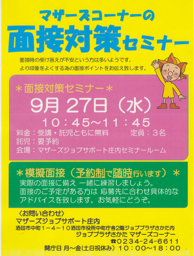 9月マザーズジョブサポート庄内 求職支援セミナー『マザーズコーナーの 面接対策セミナー』 を行います! このセミナーは 「面接は久しぶりなので不安だなぁ」 「子どもに関する質問に どう答えればいいんだろう?」 面接が心配or苦手… という方におすすめ! 面接への不安を解消するために より印象をよくする為のふるまいや 受け答えについてポイントをお伝え します。 ハローワークマザーズコーナーでは 定期的にセミナーを開催します。 奮ってご参加下さい。 受講後も疑問点など、 窓口にてご相談が受けられます。 【日 時】 9月27日(水) 10時45分〜11時45分【対 象】 お仕事探し中の子育てママさん【会 場】 マザーズジョブサポート庄内 セミナールーム【料 金】 受講料 及び 託児料 無料 ※お申込みが必要です。【託 児】 ※事前登録・予約が必要です。 ※併設の保育ルームで、保育スタッフが お子さんをお預かりします。 ママは安心して受講いただけます。 【駐車場について】 お車でお越しの際は、中町庁舎脇にある セントラルホテル契約駐車場をご利用ください。 (ジョブプラザさかたと表示してあります。) ※契約駐車場が満車の場合は、 酒田市中央地下駐車場をご利用ください。 ご利用の方は、無料駐車券を(最大2時間) を発行いたします。 お帰りの際に、マザーズ窓口へお声がけください。※模擬面接 (予約制で随時行います) 面接のご予定がある方は応募先に合わせ具体的な アドバイスを致します。 どうぞ、お気軽にお問い合わせくださいね。 ◇お申込み・お問い合わせ◇ マザーズジョブサポート庄内 TEL:0234-24-6611(ハローワークマザーズコーナー) TEL:0234-28-8061(コンシェルジュコーナー)