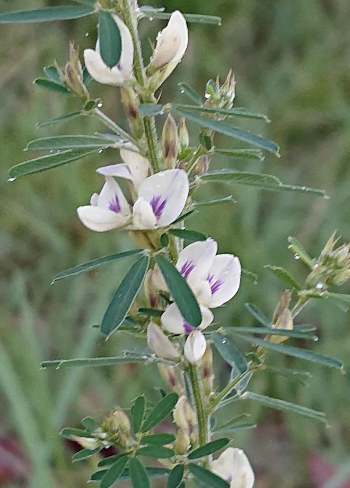 ●散歩道の土手に小さな白い花をつけた「メドハギ」でしょうか 茎がよく枝分かれしていたるところに生えています 茎に2〜4個ずつ集まって萩のような淡い黄白色の花がついています 葉を落とした茎を占いのメド竹の代わりに用いたことから「メドハギ」という名前が付いたのだそうです