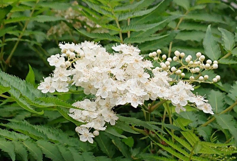 ●友人の庭に真っ白な「ニワナナカマド」が咲いており思わず写真を撮らせてもらいました 伸びた枝の先に5枚の花びらをもつ小さな花とたくさんの雄しべと先が分かれている雌しべがついており 雄しべは花びらと同じような大きさであることが写真でもわかるようによく目立ちます ナナカマドは美しく紅葉し赤い実を実らせますが「ニワナナカマド」は紅葉せず実を実らせますが熟しても赤くならないそうです ナナカマドの仲間だとおもっていると少々残念に思うかもしれませんが初夏から初秋に咲く白い花は美しく心が癒される花木の一つです